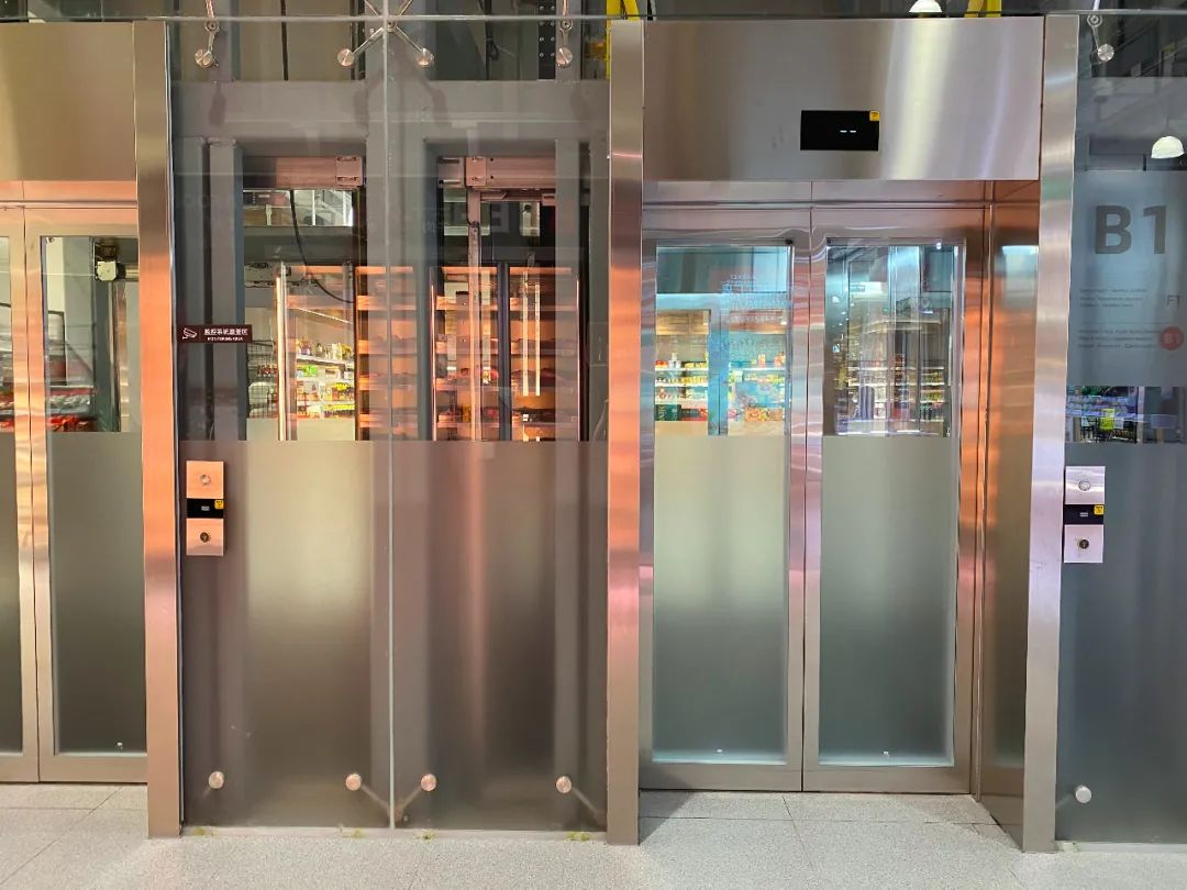 从一层通往B1层肉禽水产和餐厅区域,采用了shopping mall的观光电梯。