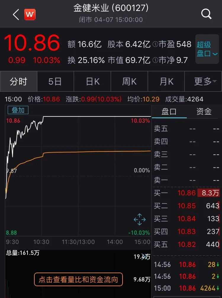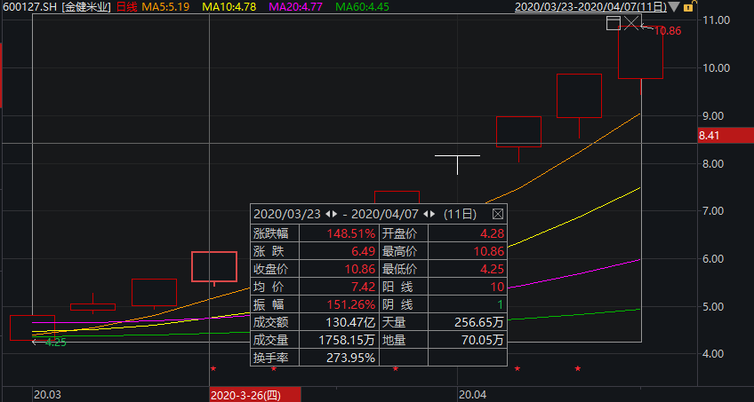 在3月30日至4月3日期间,金健米业就已经连续5涨停。至4月7日,金健米业已斩获6连板。