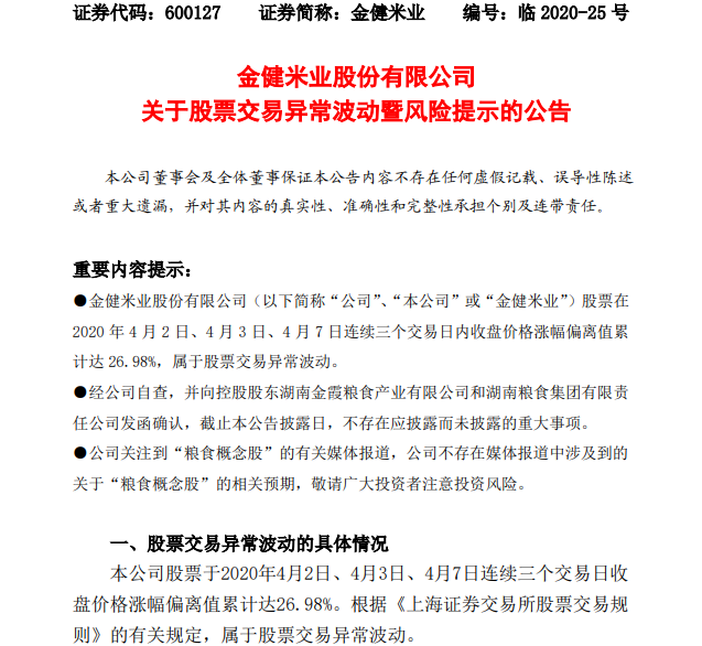 4月7日晚,金健米业公告显示,“经公司自查,并向控股股东湖南金霞粮食和湖南粮食集团发函确认,不存在应披露而未披露的重大事项。公司关注到“粮食概念股”的有关媒体报道,公司不存在媒体报道中涉及到的关于“粮食概念股”的相关预期,敬请广大投资者注意投资风险。公司主营业务为粮油食品加工和贸易类业务,近年来主营业务盈利能力较弱损。”