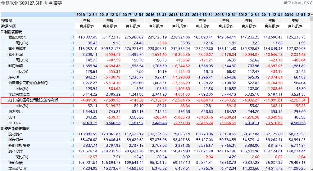 当年,金健米业扣非后净利亏损4841.95万元。至此,上市公司扣非后净利已经连亏13年。
