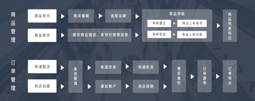 商品审核上,每一个专柜都可以随时自行选择商品、上传素材、发起上架修改商品需求,通过审核后即可一键上架或修改商品。