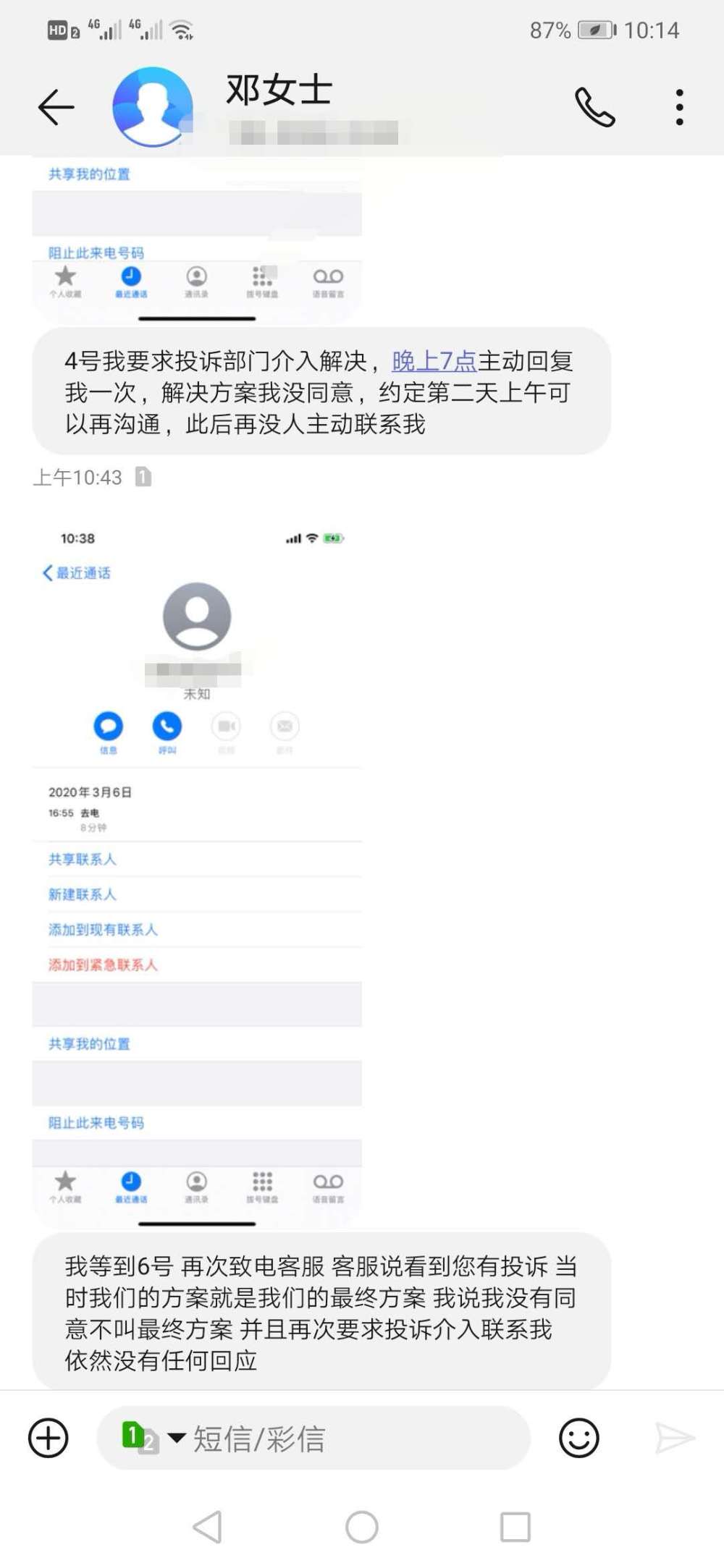 “我先后主动联系了他们三次,其中两次还另约了时间,但直接无任何反馈了。”继3月4日投诉无果后,邓为两天后再次致电客服。她告诉记者,平台想以代金券赔偿,但自己不愿意接受,要求再次协商。她诉求3倍金额赔偿且解释道歉。截至发稿,邓为称未得到满意的答复。