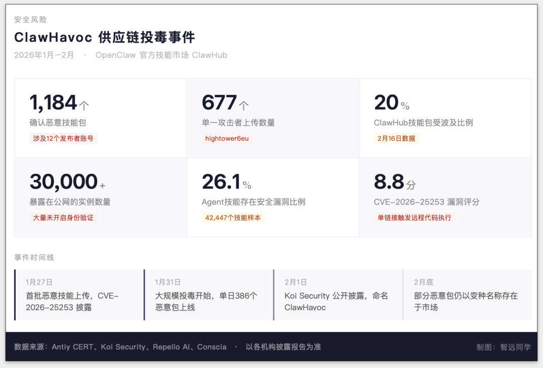2月爆发的《ClawHavoc》供应链投毒事件,1184个恶意技能被植入,影响超过13.5万台设备。有用户因为把谷歌账号接入了有问题的Skills,触发平台异常检测,整个谷歌账号直接被封,邮箱、油管全没了。