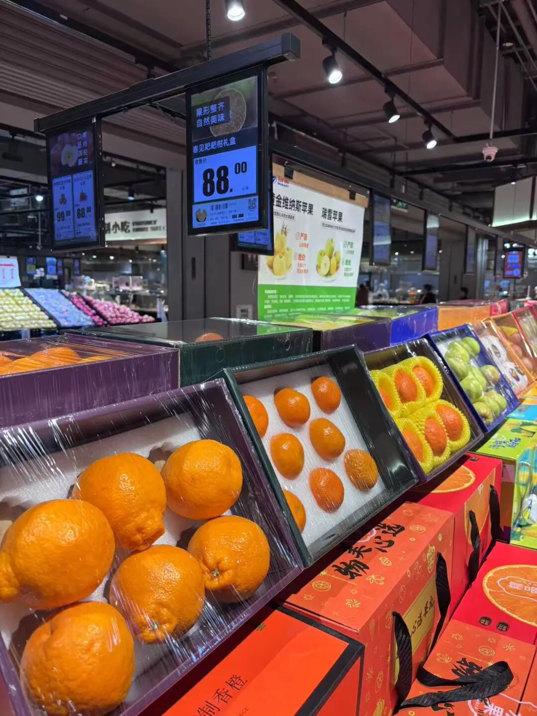 此外,从水果区来看,店内也上架了一些水果礼盒。128元一盒的脆密金柑礼盒、128元/盒的爱妃苹果礼盒、88元6个装的春见耙耙柑礼盒等。